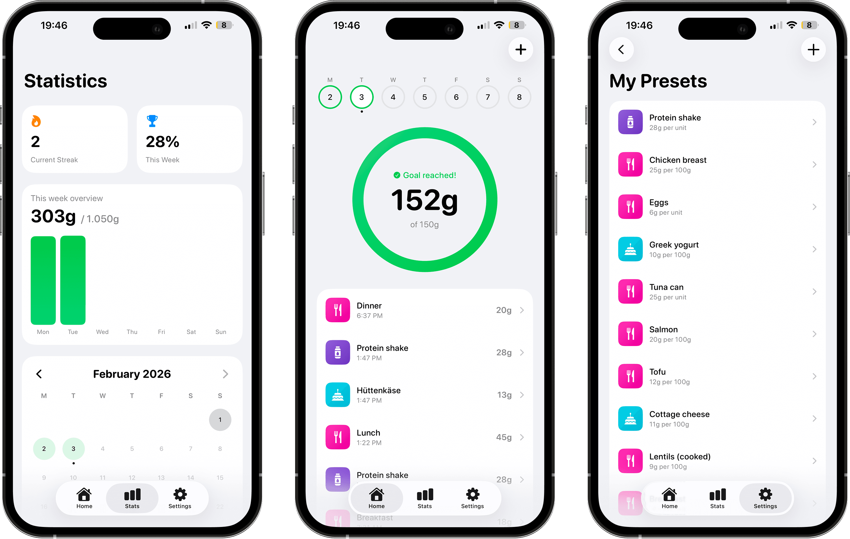 Daily protein tracking with a simple history view and saved presets. Weekly and monthly charts show how you’re progressing over time. That’s it. No hidden features. No extras locked behind a paywall. Simplicity is hard to get right. We worked hard to keep it that way and we plan to keep it that way.